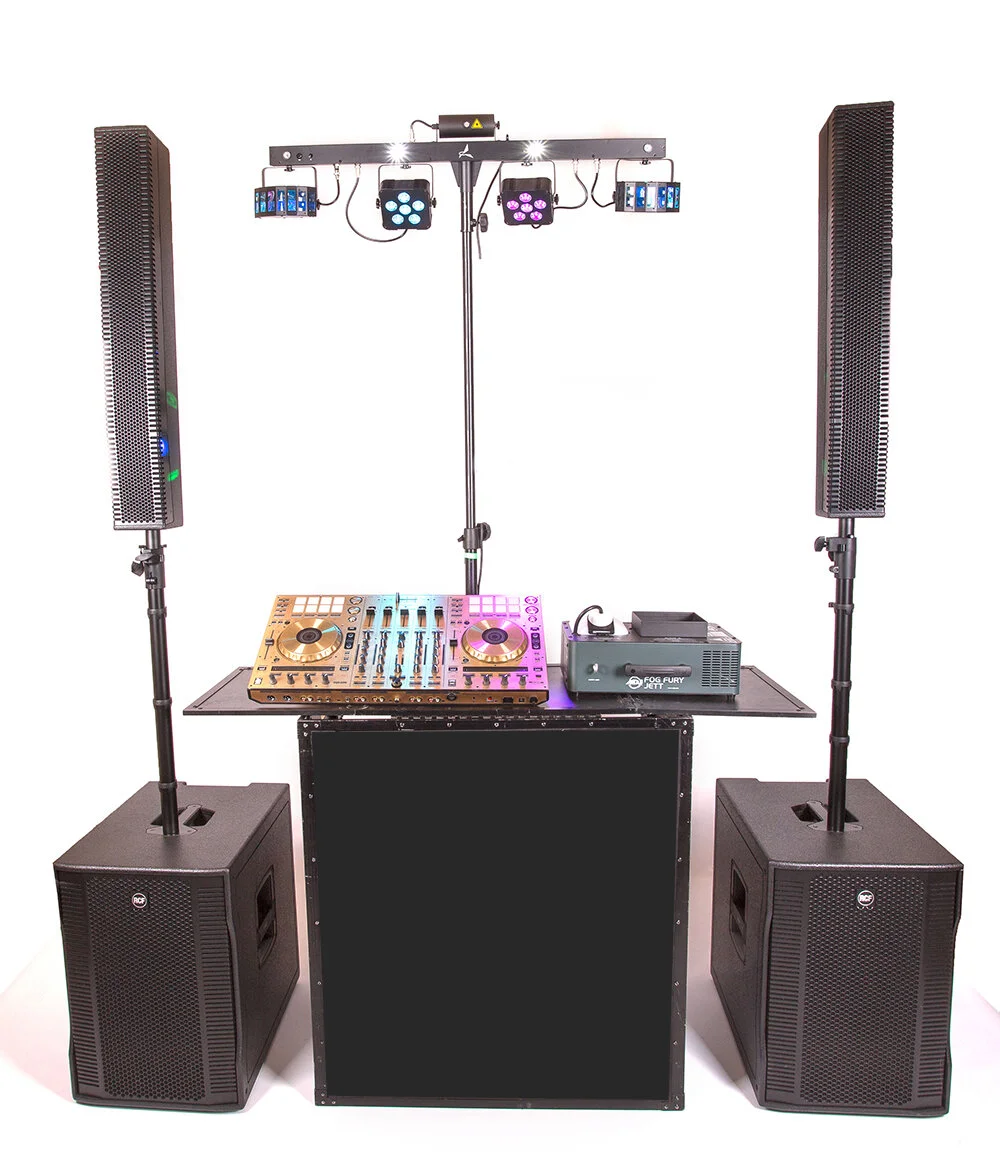 Allt du behöver för riktigt bra ljud ingår; högtalare för både bas och toppar, controller och dj-bås. Dessutom ljusramp med laser, transport och riggning. I det större paketet ingår även en rökmaskin.